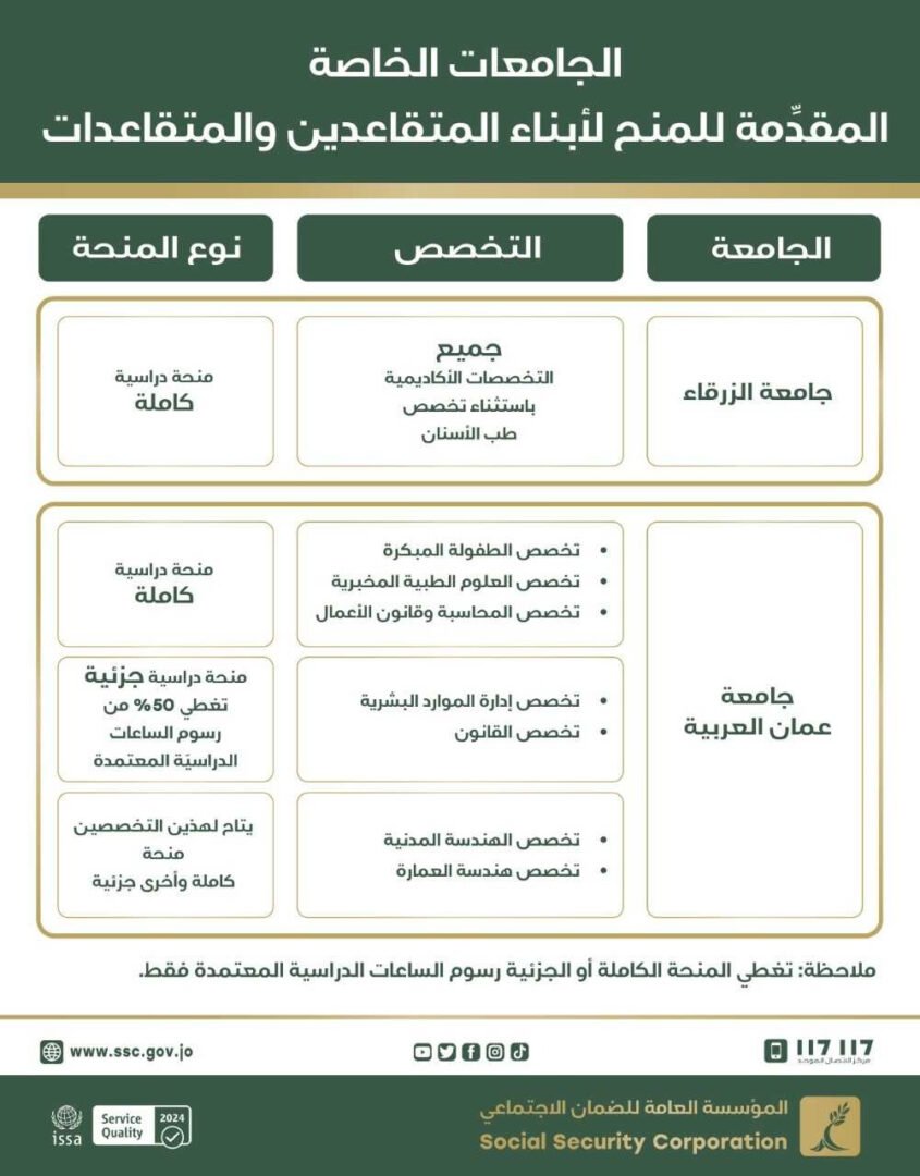 أعلنت المؤسسة العامة للضمان الاجتماعي عن فتح باب التقديم للاستفادة من المنح الدراسية الجامعية لأبناء المتقاعدين والمتقاعدات الأردنيين؛ للحصول على درجة البكالوريوس للعام الدراسي 2025/ 2026 وذلك بالشّراكة مع جامعتي الزّرقاء وعمّان العربية.
