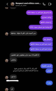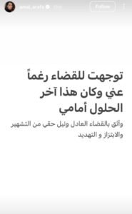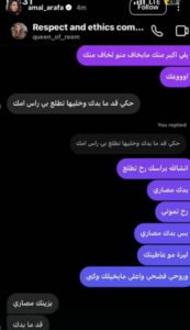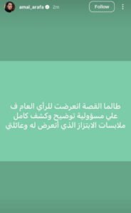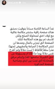 ونشرت أمل عرفة عبر خاصية “الستوريز” الرسائل التي وجّهت لابنتها، والتي تحمل الكثير من عبارات التهديد والابتزاز، وهو ما أجبرها على الردّ بقوة لحماية ابنتها والدفاع عنها، وأظهرت محادثة مع ابنتها الطرف الآخر وهو يطالبها بمبلغ 15 ألف دولار مقابل ألاّ تشوّه الصفحة سمعتها، وقد حرصت أمل عرفة على عرض اسم الصفحة بوضوح أمام الرأي عام.
