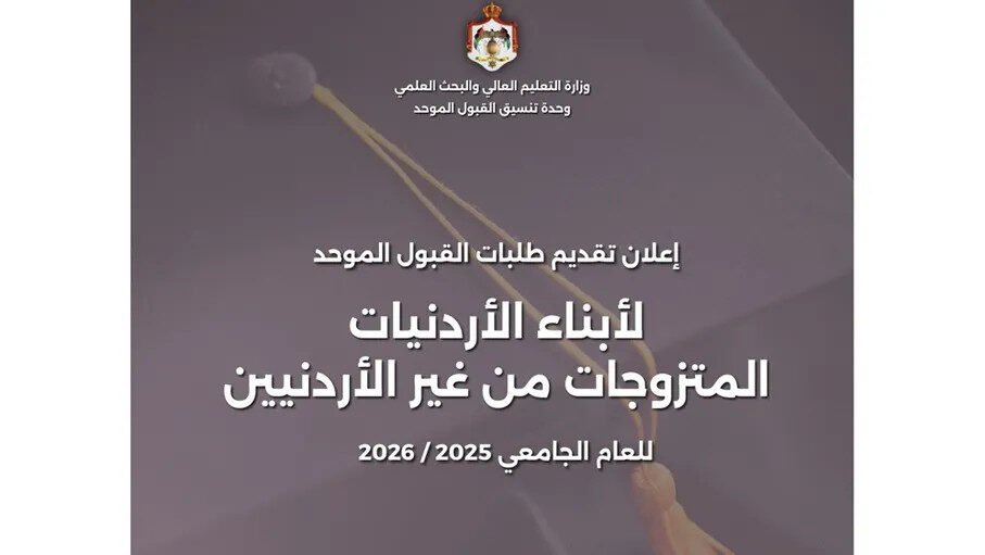 أعلنت وحدة تنسيق القبول الموحد في وزارة التعليم العالي والبحث العلمي بأن عملية تقديم طلبات الالتحاق الإلكترونية بالجامعات الأردنية الرسمية للطلبة أبناء الأردنيات المتزوجات من غير الأردنيين تبدأ اعتباراً من صباح يوم الأربعاء الموافق 24-9-2025 وحتى الساعة (3) الثالثة عصر يوم السبت الموافق 27-9-2025، وذلك من خلال الموقع الإلكتروني للوحدة/ قسم البكالوريوس على الرابط التالي: