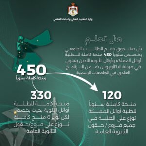 وأكدت الوزارة في بيان، أن تخصيص هذه المنح يعكس حرص الدولة الأردنية على رعاية الطلبة المتفوقين وتقديرا لجهودهم ودعما لمسيرتهم التعليمية واستثمارا في مستقبلهم باعتبارهم عماد الوطن.