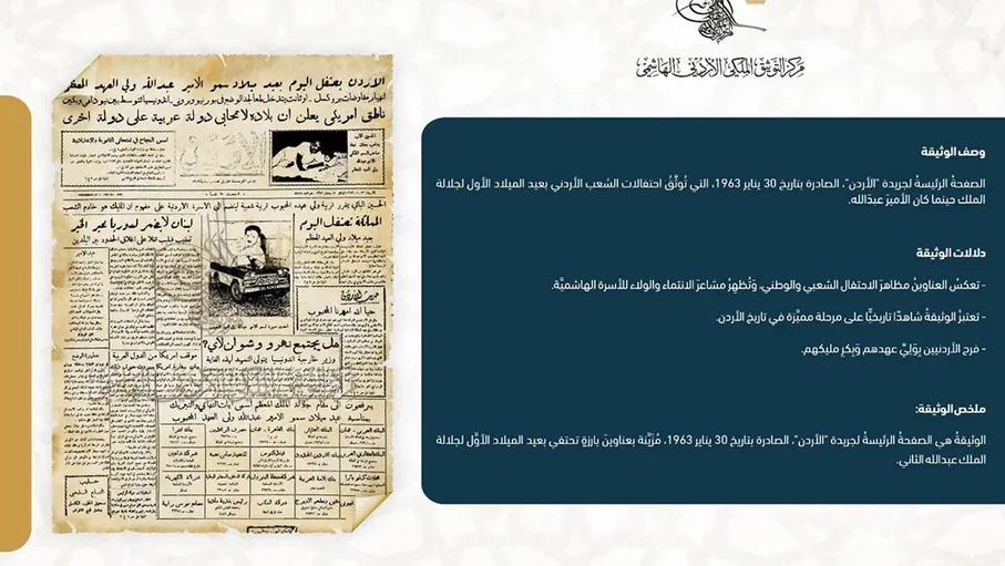 عرض مركز التوثيق الملكي الأردني الهاشمي وثيقة تاريخية بمناسبة ذكرى ميلاد جلالة الملك عبدالله الثاني بن الحسين، تبرز الصفحة الرئيسة من العدد الصادر بتاريخ 30 كانون الثاني من عام 1963 لجريدة “الأردن”، والتي تظهر الاحتفاء بعيد الميلاد الأول لجلالته الذي كان حينها الأمير عبدالله.