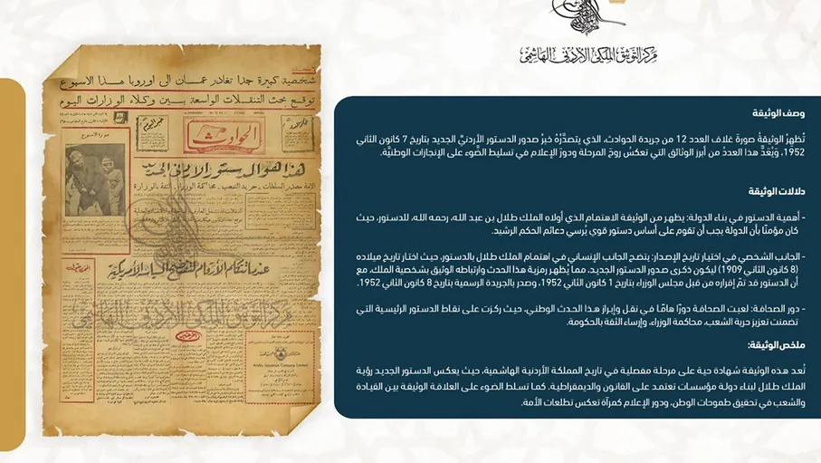 عرض مركز التوثيق الملكي الأردني الهاشمي وثيقة تاريخية من أرشيفه، تظهر صورة غلاف العدد 12 من جريدة الحوادث، الصادر بتاريخ 7 كانون الثاني 1952 في احتفائه بصدور الدستور الجديد للمملكة الأردنية الهاشمية.