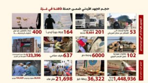 منذ اندلاع العدوان، تحركت المملكة الأردنية الهاشمية على جميع المستويات الدبلوماسية والإنسانية لتأمين ممرات آمنة لإيصال المساعدات إلى قطاع غزة، وأصبحت الأردن المنفذ الرئيس للمساعدات الإغاثية إلى داخل القطاع عبر الممر الإغاثي الأردني، الذي جمع بين الجهود الوطنية لمختلف مؤسسات الدولة، وفي مقدمتها القوات المسلحة الأردنية – الجيش العربي، وسلاح الجو الملكي، ووزارة الخارجية وشؤون المغتربين، والهيئة الخيرية الأردنية الهاشمية، في نموذج فريد من التكامل الوطني الإنساني.