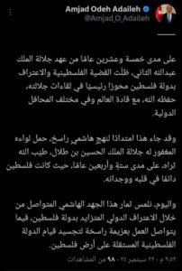 العضايلة: اليوم نلمس ثمار الجهد الهاشمي المتواصل من خلال الاعتراف الدولي المتزايد بفلسطين