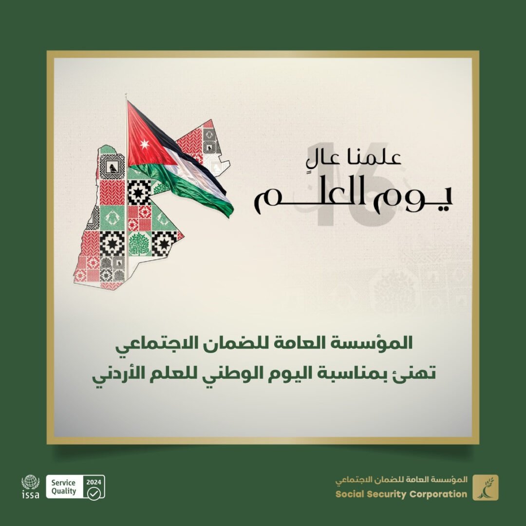 تتقدم المؤسسة العامة للضمان الاجتماعي بأسمى آيات التهنئة والتبريك إلى مقام حضرة صاحب الجلالة الهاشمية الملك عبد الله الثاني ابن الحسين، وسمو ولي عهده الأمين، وإلى أبناء الشعب الأردني كافة، بمناسبة اليوم الوطني للعلم الأردني الذي يصادف السادس عشر من نيسان من كل عام.