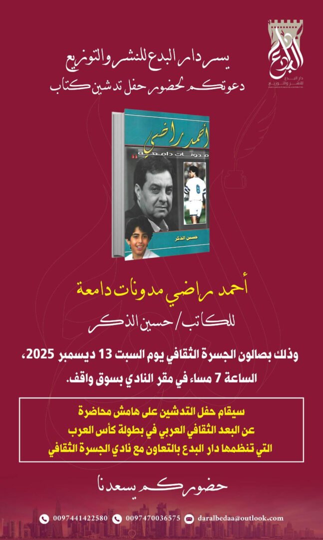 على صعيد متصل تدشن دار البدع للنشر والتوزيع القطربة بادارة الإعلامية نجاة علي حفل توفيع كتاب (أحمد راضي مدونات دامعة ) للكاتب العراقي حسين الذكر وذلك بصالون الجسرة الثقافي يوم السبت 13 ديسمبر 2025