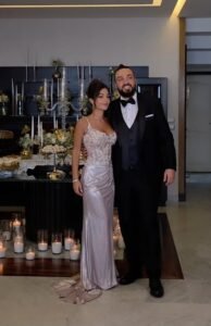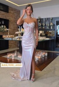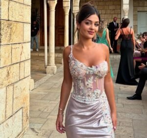 ولفتت الشابة الصغيرة الأنظار بجمالها وأناقتها في حفل زفاف شقيقها كريستوفر، واختارت للمناسبة فستاناً مميزا يناسب سنها ويلائم جسمها الممشوق حمل توقيع المصمم اللبناني جان بيار لحود، وجاء بتدرجات اللون البنفسجي الناعم بتصميم راق، فجاء من الأعلى بقصّة الكورسيه المطرز بالدانتيل والأحجار الكريستالية الملونة وبحمالة صدر واحدة مزينة بالأحجار، لينسدل من الأسفل بقماش لامع مع فتحة ساق عالية ودانتيل ناعم يمتد من الخصر الى أعلى الفتحة الجانبية بتصميم أنيق وفخم.