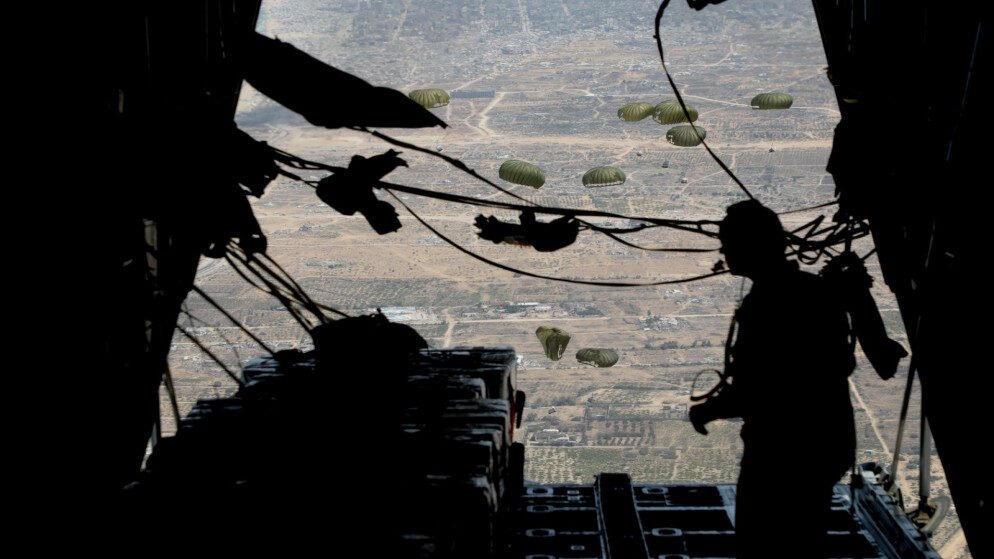 خبر جديد: نفذت القوات المسلحة الأردنية، الأربعاء، عملية إنزال جوي إلى قطاع غزة، شاركت فيها بالإضافة إلى طائرات سلاح الجو الملكي الأردني، طائرات من كل من جمهورية ألمانيا الاتحادية ودولة الإمارات العربية المتحدة وجمهورية فرنسا ومملكة هولندا وجمهورية سنغافورة وجمهورية إندونسيا، حيث تم إسقاط نحو (62) طناً من المواد الغذائية والإغاثية داخل القطاع.