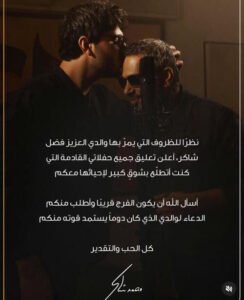“نظراً للظروف التي يمر بها والدي العزيز فضل شاكر، أعلن تعليق جميع حفلاتي القادمة التي كنت أتطلع بشوق كبير لإحيائها معكم. أسأل الله أن يكون الفرج قريباً، وأطلب منكم الدعاء لوالدي الذي كان دوماً يستمد قوته منكم. كل الحب والتقدير”.