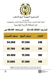 وحسب النشرة الصباحية التي أصدرتها النقابة العامة لأصحاب محلات تجارة وصياغة الحلي والمجوهرات، بلغ سعر الغرام الواحد من الذهب عيارات 24 و18 و14 لغايات البيع من محلات الصاغة عند 97.5 و75.5 و57.3 دينار على التوالي.
