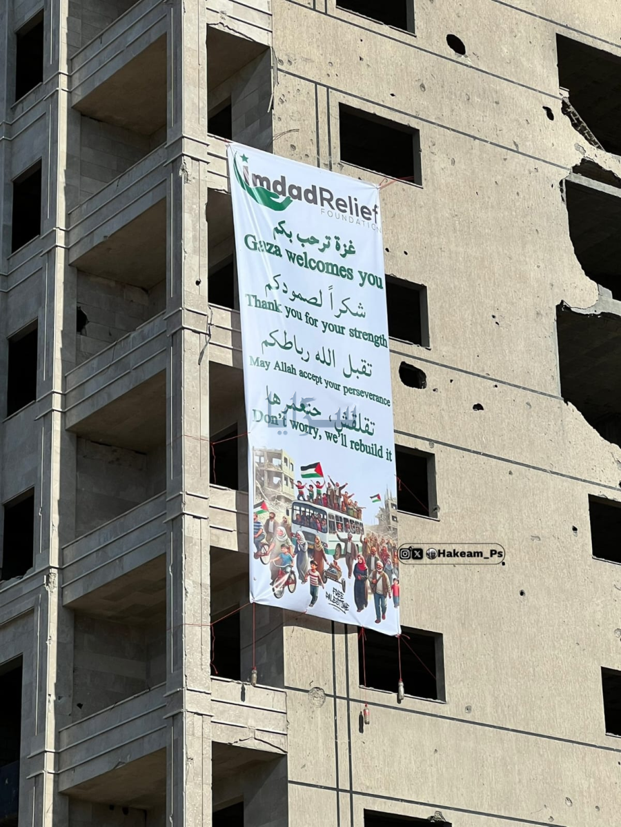 وكتب على اللافتة، غزة ترحب بكم، شكرا لصمودكم، تقبل الله رباطكم، تقلقش حنعمرها.