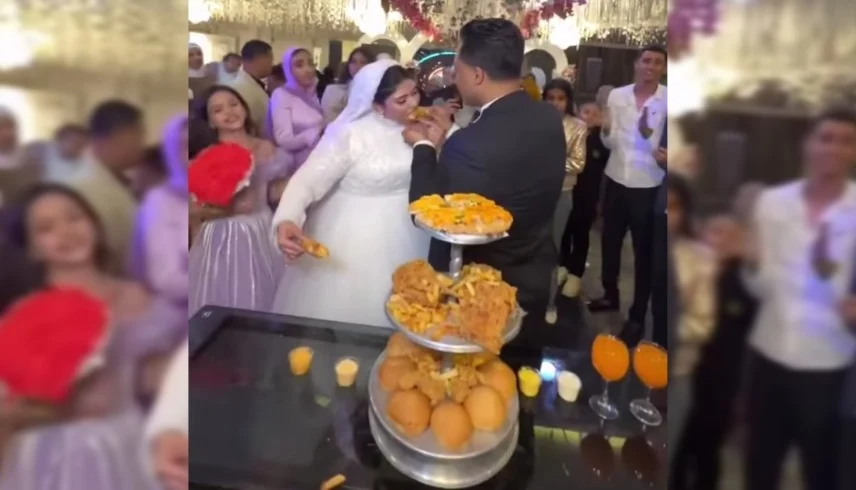 أثار مقطع فيديو متداول من إحدى حفلات الزفاف في مصر جدلاً واسعاً على مواقع التواصل الاجتماعي، بعد أن ظهر فيه عروسان يستبدلان كعكة الزفاف التقليدية بوجبات سريعة من الدجاج المقلي ورقائق البطاطس ومشروبات غازية، في مشهد خرج عن المألوف في مثل هذه المناسبات.