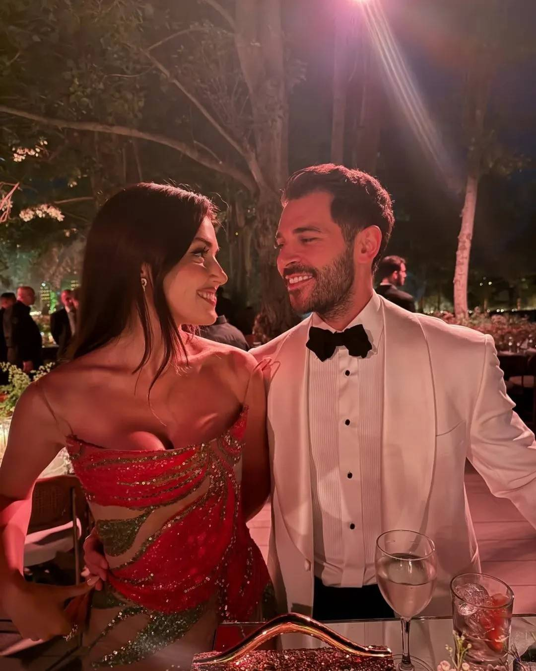 وتداول رواد مواقع التواصل الاجتماعي مقاطع عفوية للنجمة التركية التي أطلت بفستان مبهر باللون الذهبي، وبدت في كامل أناقتها وسعادتها مع خطيبها رجل الأعمال التركي، حيث ظهرت في إحدى المقاطع وهي ترقص بإنسجام وحماس كبيرين على أنغام الموسيقى، في لقطات عفوية.