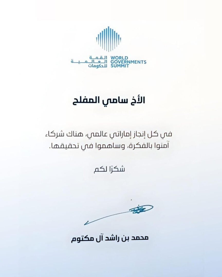 في إنجاز وطني لافت، تلقّى سامي المفلح رسالة شكر وتقدير من صاحب السمو الشيخ محمد بن راشد آل مكتوم، نائب رئيس الدولة رئيس مجلس الوزراء حاكم دبي، وذلك على هامش القمة العالمية للحكومات في دبي، تقديراً لجهوده المتميزة وإسهاماته المؤثرة في دعم مسارات التطوير والابتكار الحكومي.