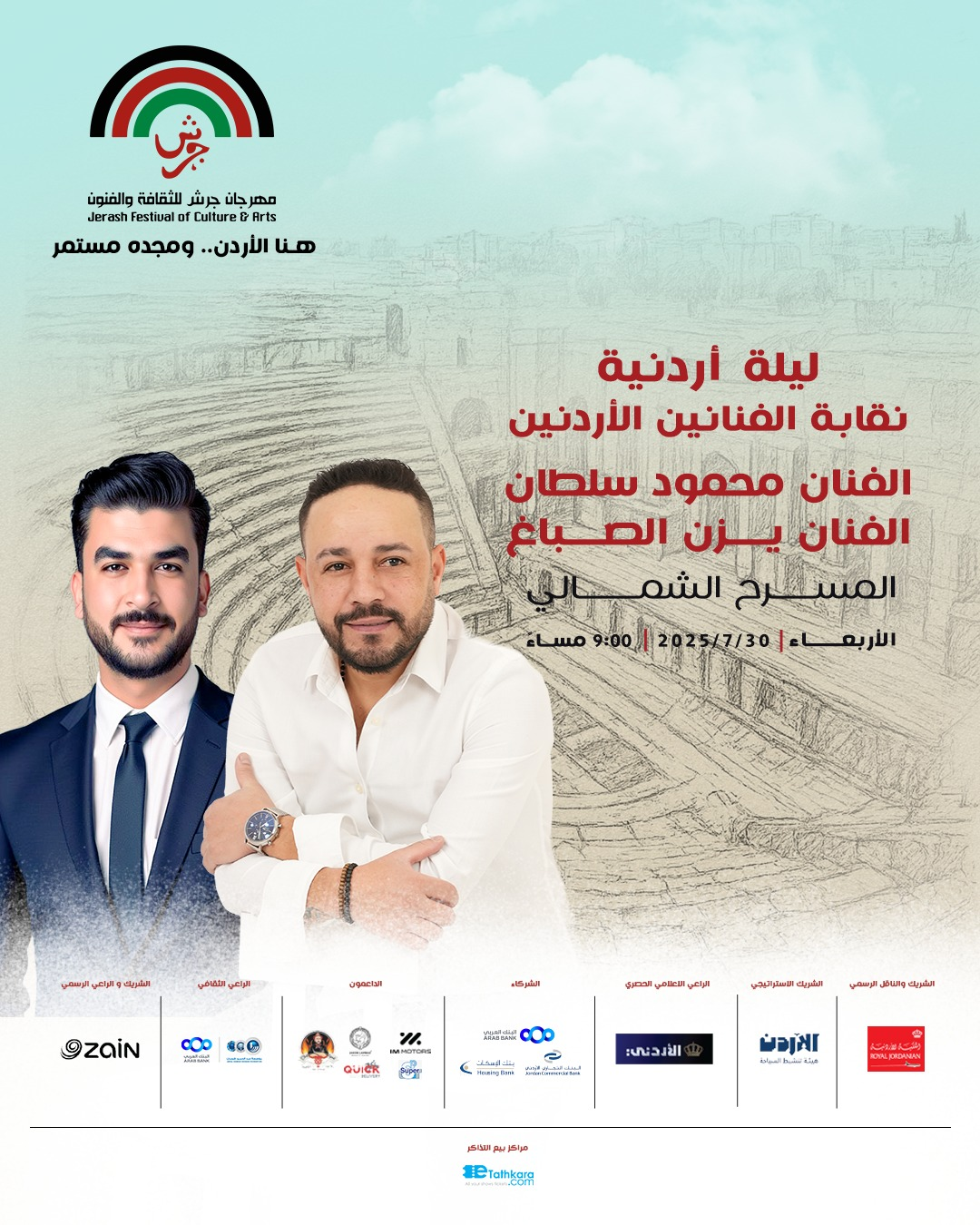ويشارك في الأمسية الفنانان محمود سلطان ويزن الصباغ، حيث سيقدمان باقة من الأغاني الأردنية والعربية وسط أجواء فنية وطنية مميزة تبدأ عند الساعة التاسعة مساءً.
