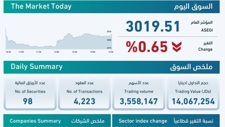وعن مستويات الأسعار، فقد انخفض الرقم القياسي العام لأسعار الأسهم لإغلاق هذا اليوم إلى 3019 نقطة، بانخفاض نسبته 0.65 بالمئة.